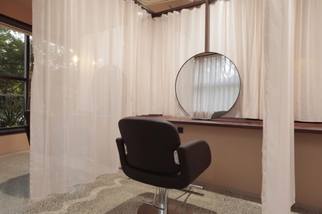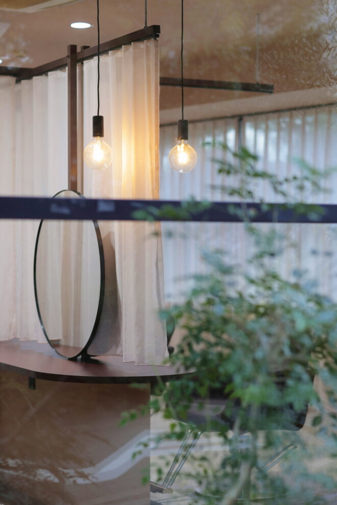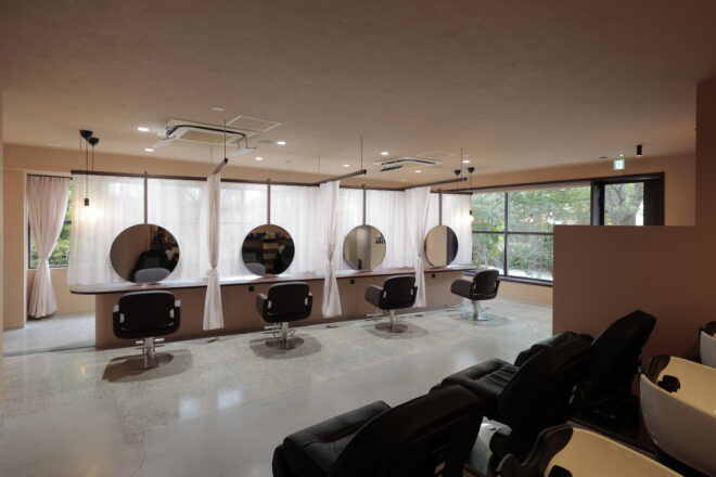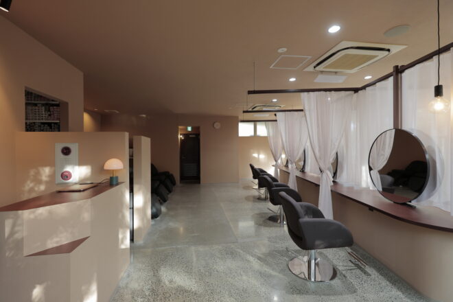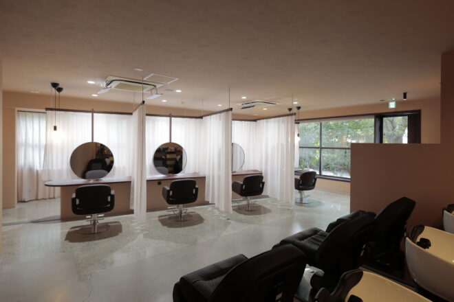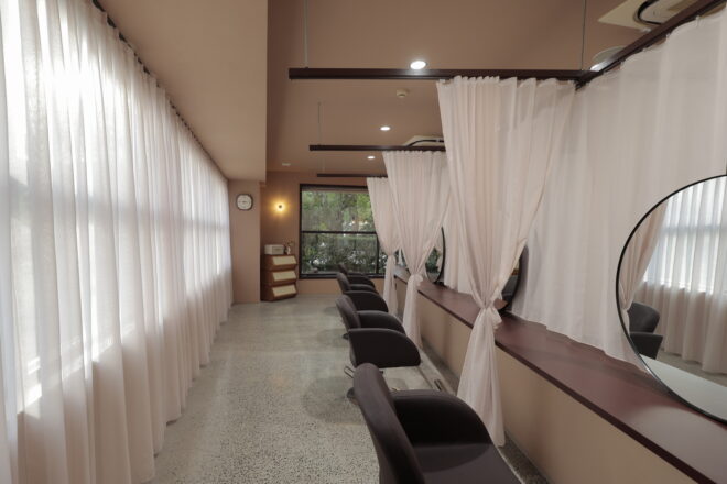 開放感と個室空間を両立させる計画です。レースのカーテンで個々を仕切り、フルフラットの落ち着いた雰囲気のお店に仕上がりました。