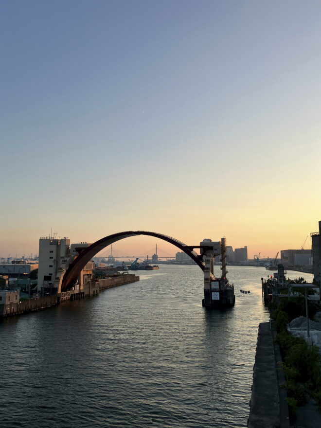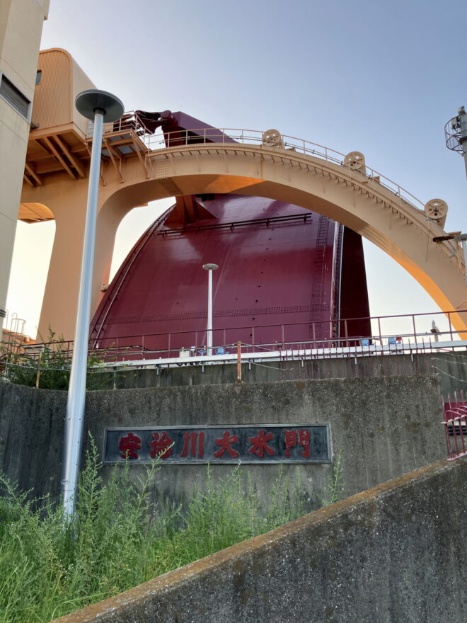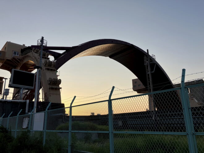 大阪に住んでもう随分経ちますが、このアーチは最近知りました。車から何度か上だけ見えたこともあって完全に「吊り橋の類」だと思い込んでて、改めて見ると橋じゃないので、近づいてみると「水門」。かなり大きな構造物なのでどう開閉するかその場で検討つかず調べると、そのダイナミックな動きに驚きました。