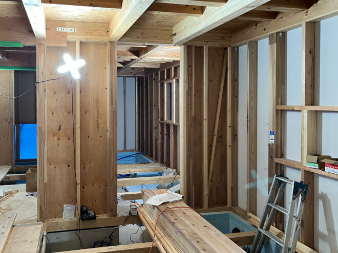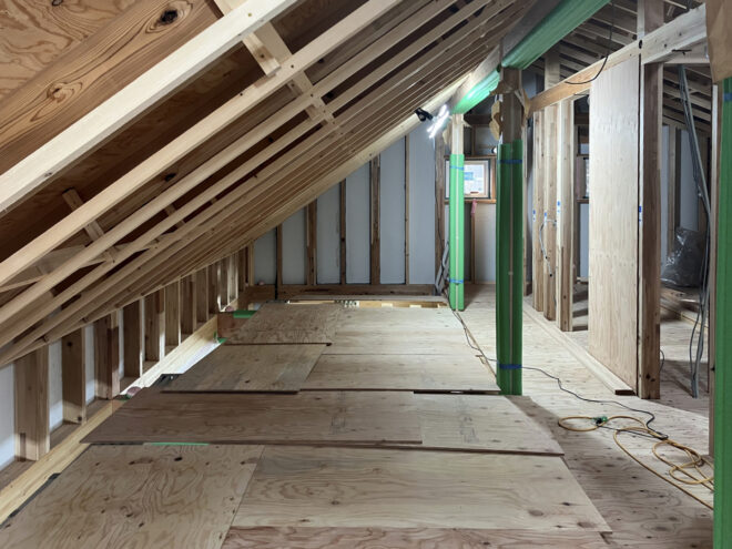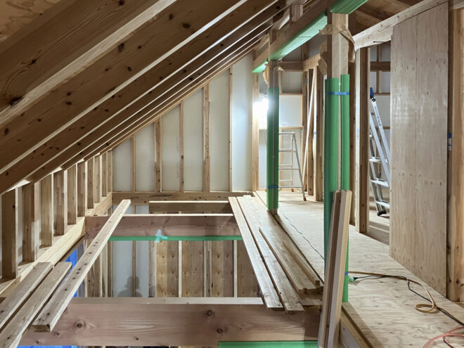吹抜けは作業用の仮床が掛けられ、天井下地が設置された状態。