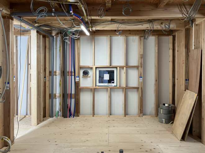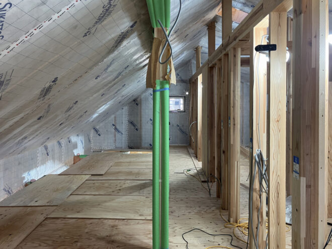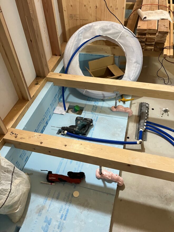 特に外周部の電気配線、給排水管の仕込みを完了した状態で、断熱材の吹込み工程に入ります。