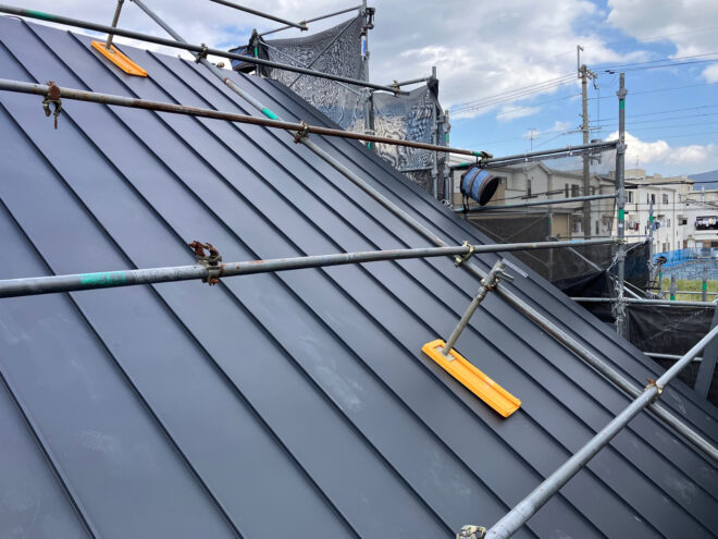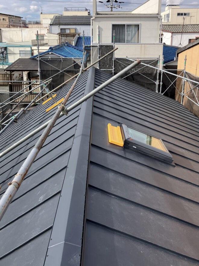 ガルバ立てハゼ葺きの大きな屋根は最大7寸勾配。作業には屋根足場が必要な勾配となります。