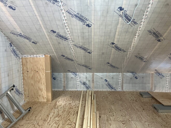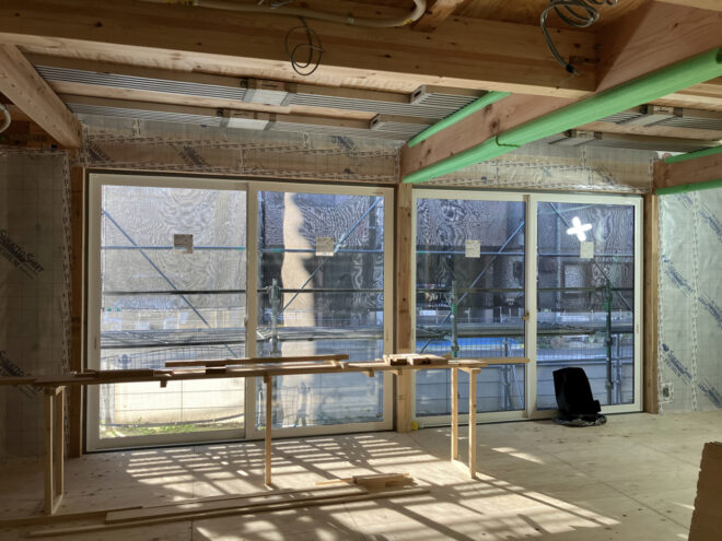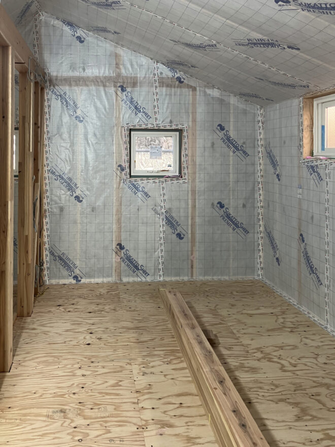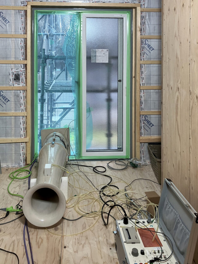 断熱工事が完了し、サッシが設置された状態でいよいよ気密測定となります。