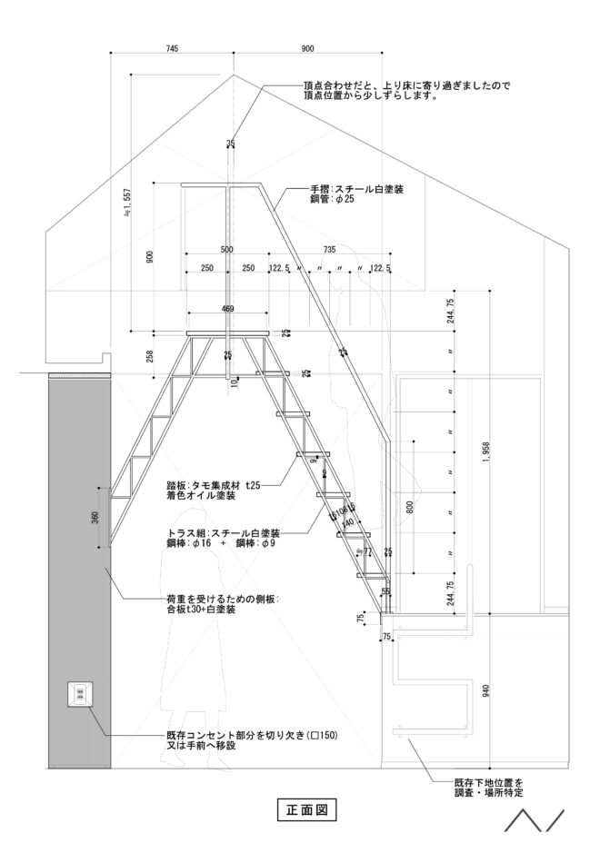 以前の設計事例にはなりますが、ロフトへのトラス階段をつくる計画の初期案の試行錯誤メモが出てきたので忘備録としての書き留めです。 (「トラス」=三角形の組合せで構成する構造形式)