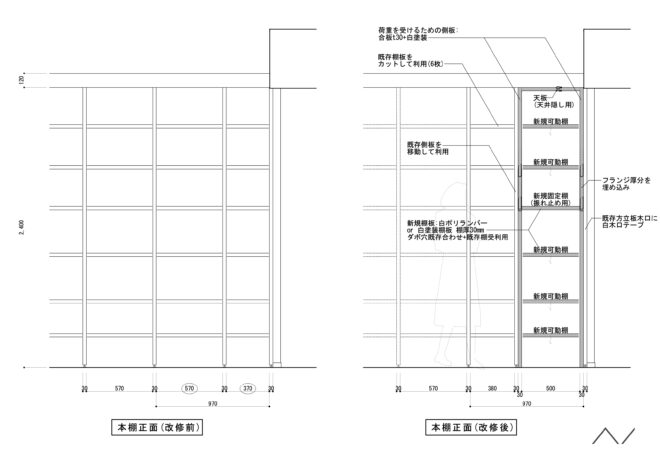 最終図です。既存本棚に階段を支える板を紛れ込ませる作戦で、設計は大変楽しく、施工はなかなかシビアでした。本棚の収納量がちゃんと維持できてるところもポイントです。
