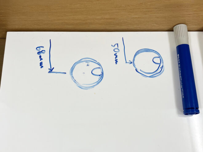 家具や金物の細かい寸法を電話やメールで聞かれたときに「ん?どうやったっけ?」ってなるときは、机に実寸で描きながら確認して写真送ったりします。(ラ はランバー合板)