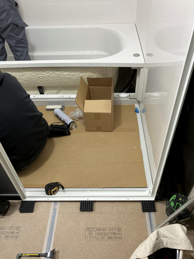 床下の梁の出っ張りをユニットバスの脚がギリギリかわせるかどうか、やってみないとわからない状況でしたが無事におさめていただき、みんなで段差のない浴室床に喜びました。