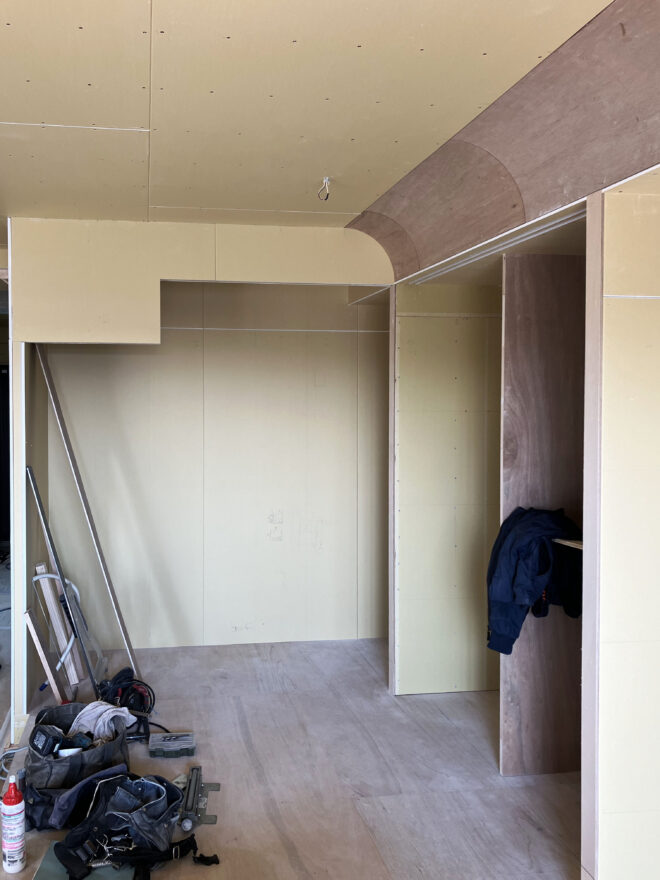 キッチンの排気ダクトも絶妙なルートを通っており、色々と検討した結果「垂壁を曲面にしておさめる」ことにしました。丁寧な曲面下地がキレイで、見えなくなるのがもったいないので写真で残しておきます。