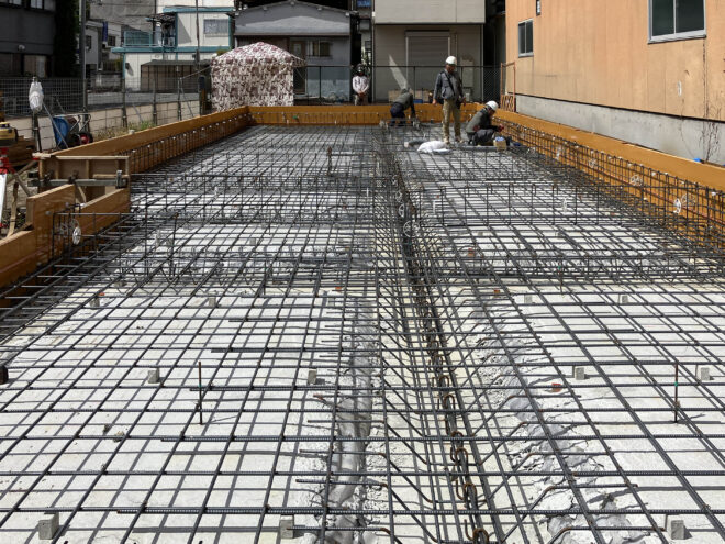 東大阪市の家の基礎工事の様子です。 土を掘り、砕石を敷き、ランマ―で地盤を突き固め、防湿シートの上を全面捨てコンクリート(作業しやすくする為の下地コンクリート)で覆います。そこへ墨 […]